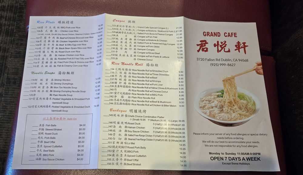 Welcome to Grand Cafe, a delightful culinary gem nestled in Dublin, CA. This casual dining spot offers a rich menu brimming with authentic Cantonese flavors, perfect for food enthusiasts seeking variety.